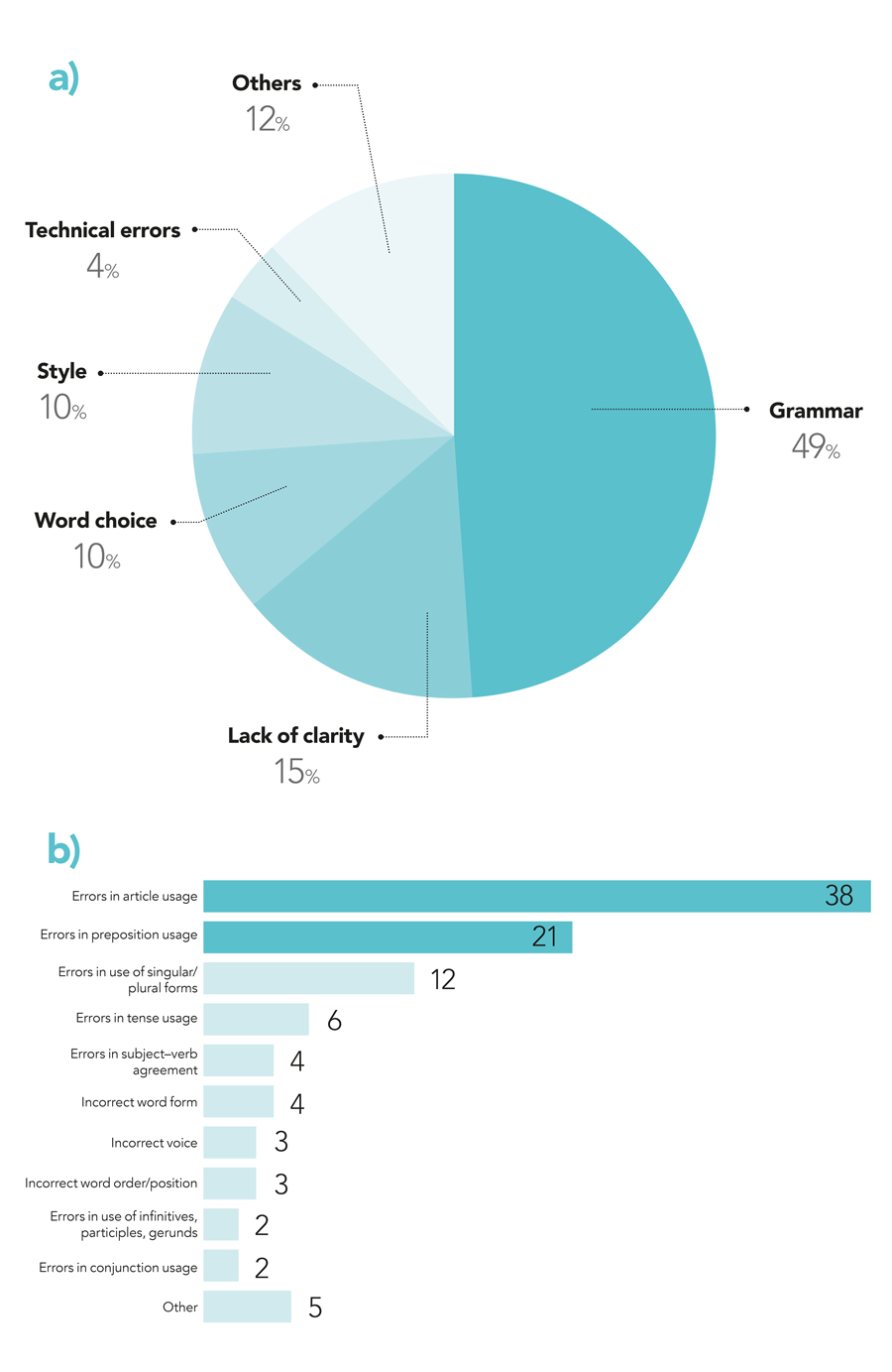 Cactus通信发布前 发现常见错误日语并中文研究者误差分析取自100论文的千字样本,日中作者每人写作这些国家的研究者大都偏差语法错误,文章用法、前置词和主题动词协议是三大类错误语法后表达清晰度是第二常用重点领域非本地英语发言人发现用英语有效描述科学有挑战性,图一和图二从分析中改编 聚焦中文和日文作者东南亚国家作者都观察到类似趋势
