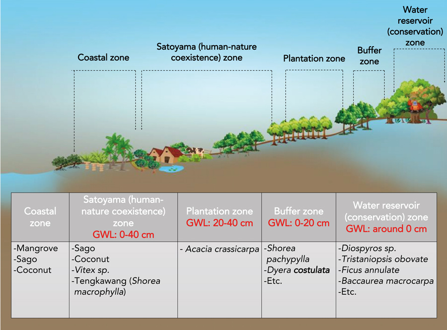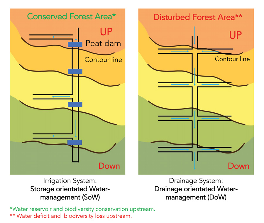 由加藤和协作者开发的创新SW方法指传统稻田灌溉蓝图,目的是实现生态系统内高水保留量方法有四大原则:1)全年稳定地下水水平;2)预防泥炭火;3)鼓励树生长;4)尽最大可能保护原生生态系统(图3)。